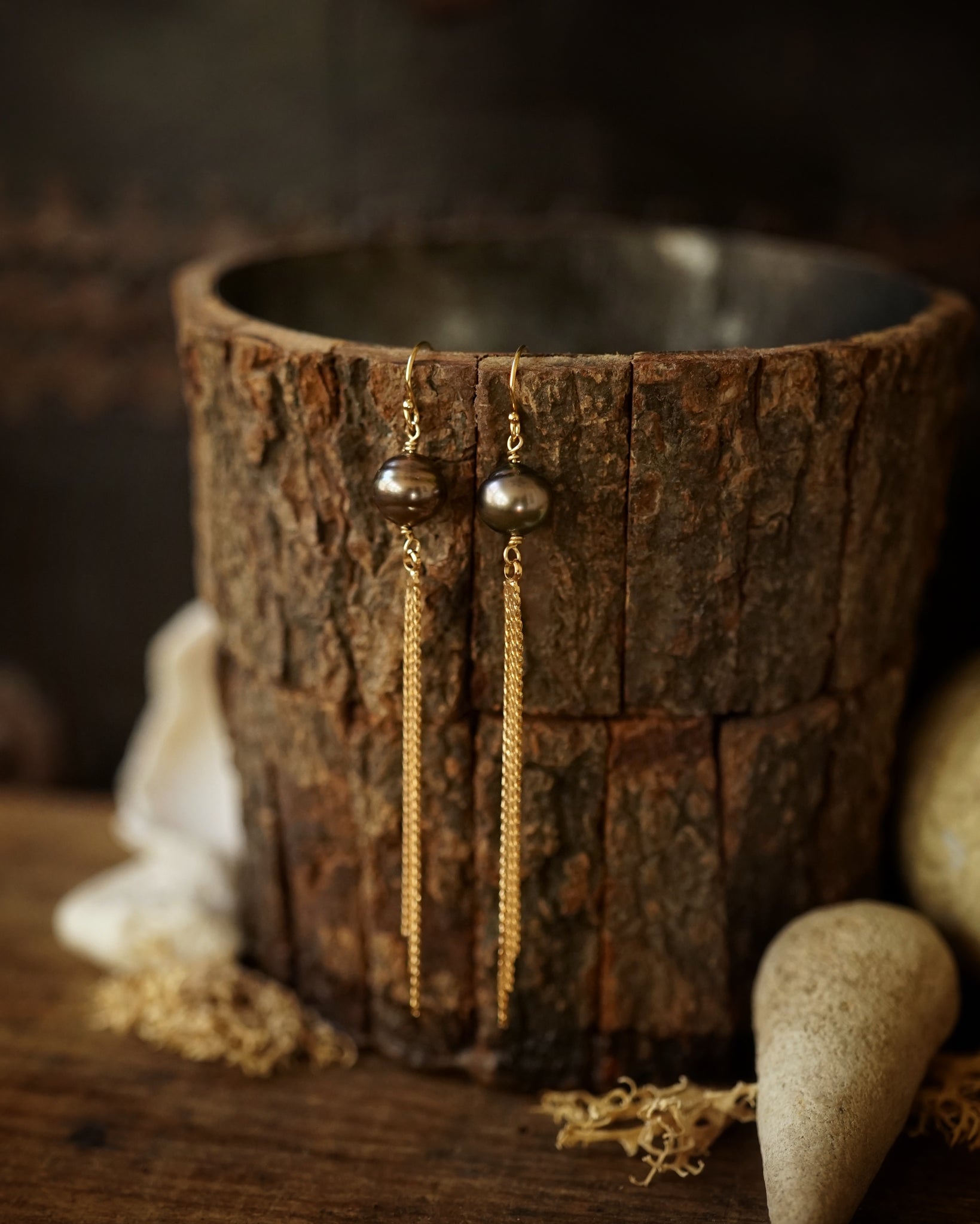 Gorgeous grade A Tahitian pearls paired with gold plated tassels dangle from gold filled earwires.