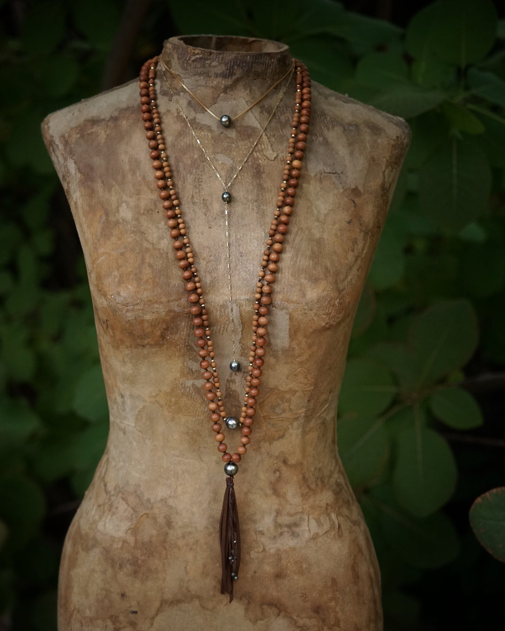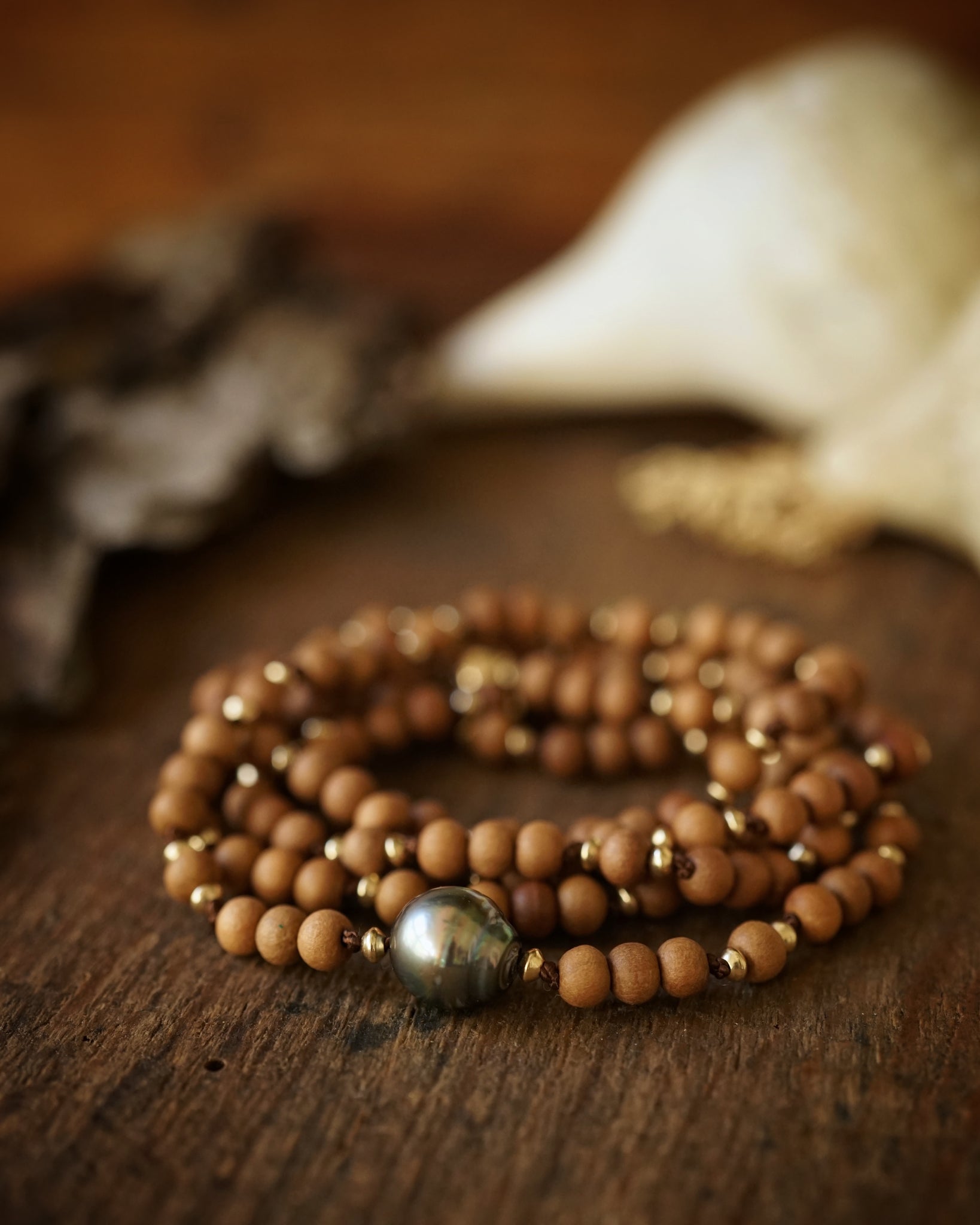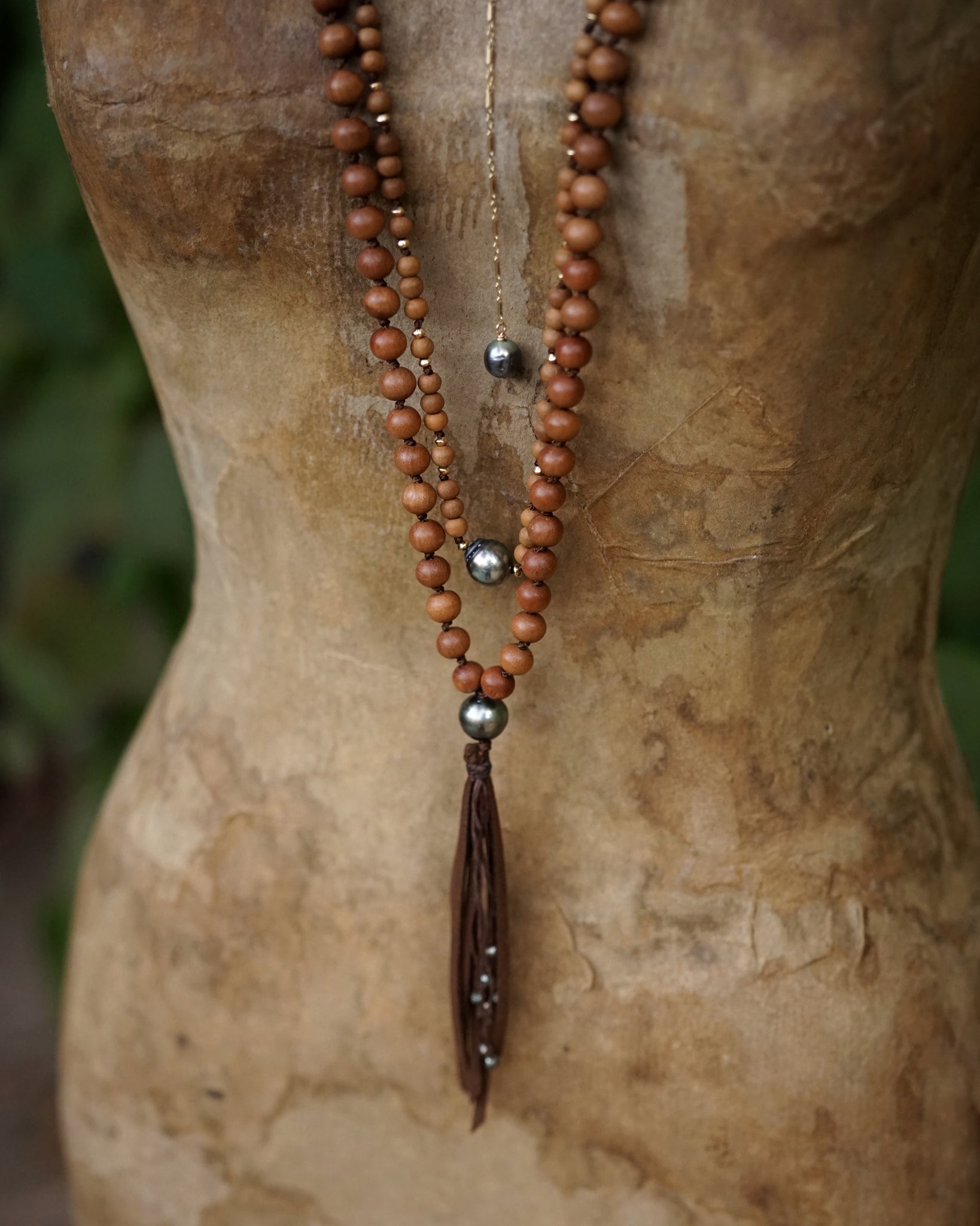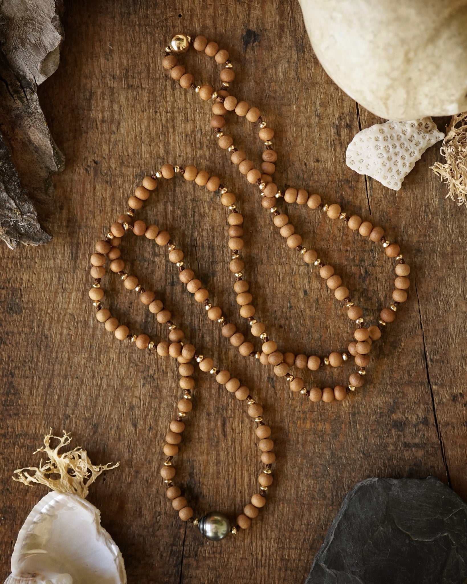This 35 inch love bead necklace is made of 5 mm sustainably harvested Indian sandalwood beads, handknotted, accented with gold filled details, finished with a single stunning grade A Tahitian pearl.