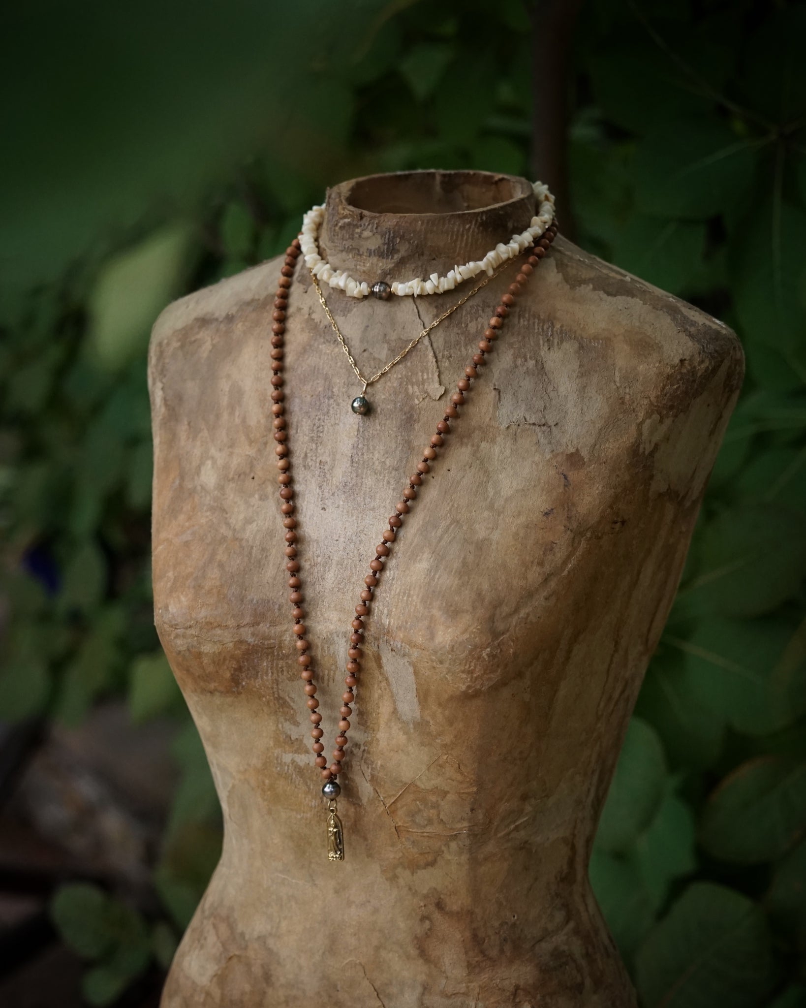 Handknotted on chocolate silk, this mala is made of 6 mm fair trade sustainably harvested sandalwood beads, finished with a single grade A Tahitian pearl and a standing buddha brass pendant.