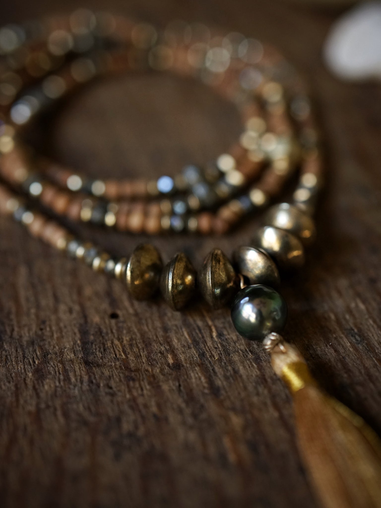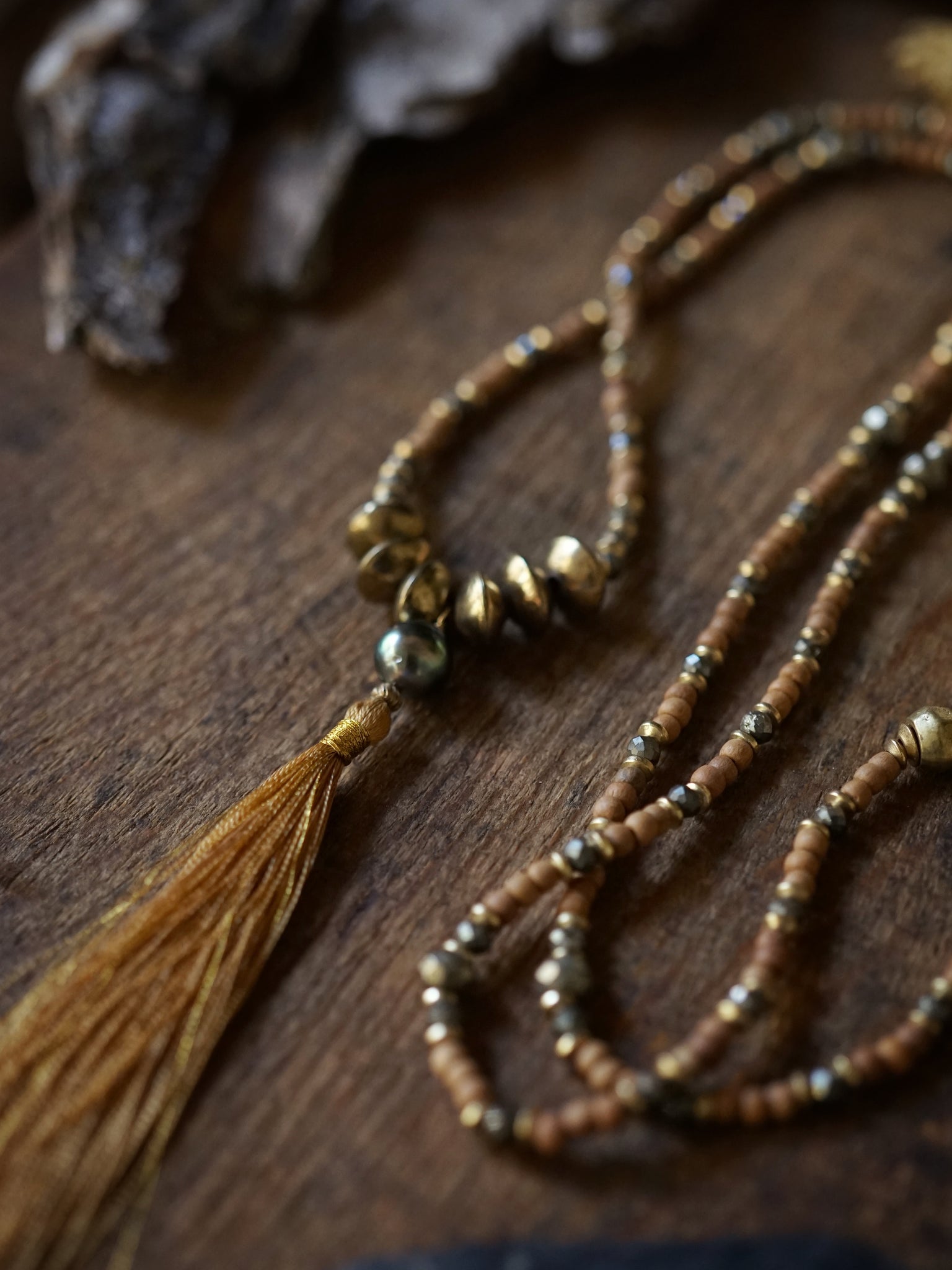This 32 inch necklace is made of fair trade sustainably harvested sandalwood beads, accented with glittering faceted pyrite rondelles, fair trade brass details, and finished with a single grade A Tahitian pearl and a a saffron colored tassel
