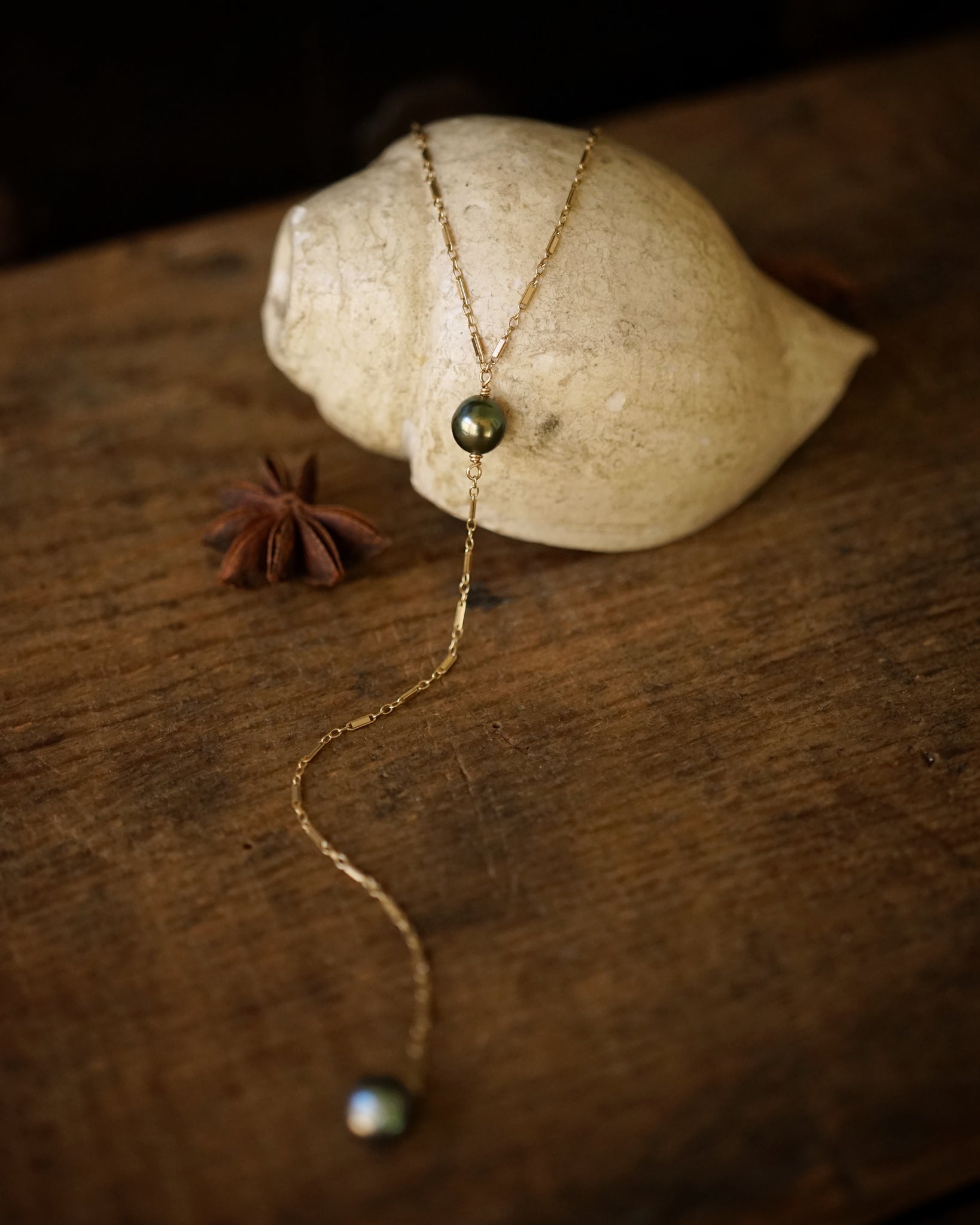 Two lustrous grade A Tahitian pearls adorn this 14k gold filled bar and link chain in this lariat style necklace.