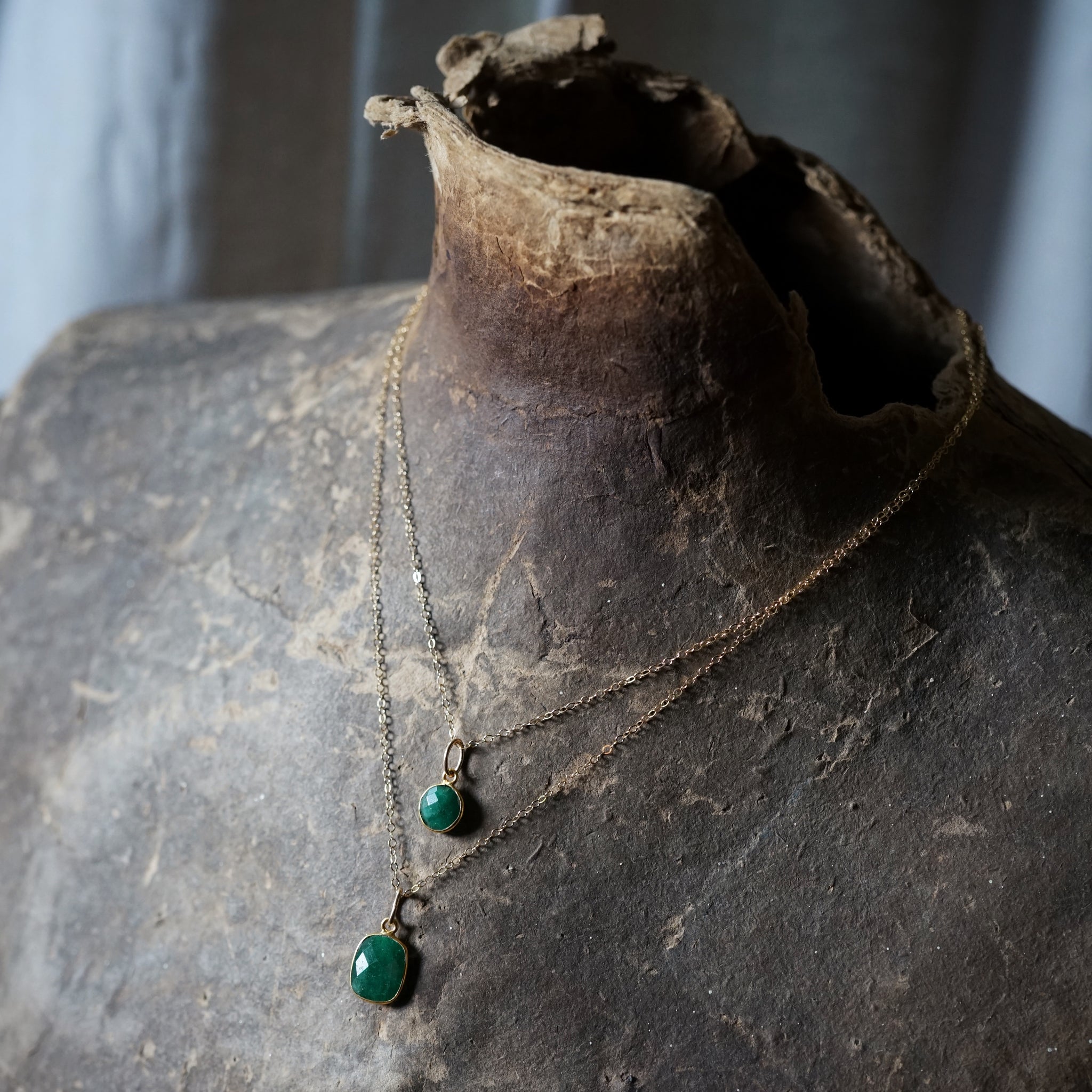 This sweet little faceted emerald pendant in a rich saturated green hue is strung on a 16 inch gold filled cable chain.